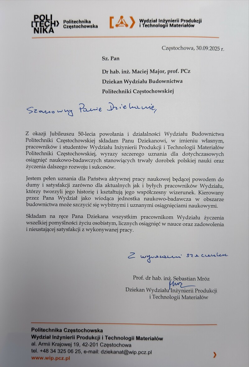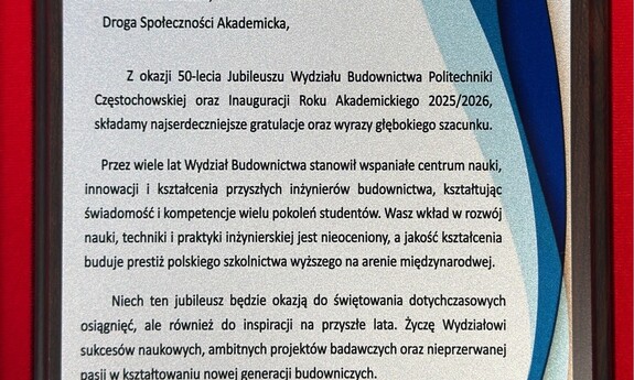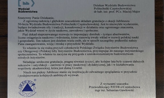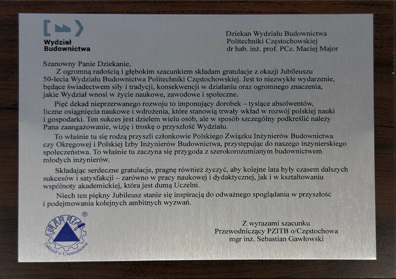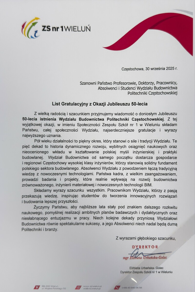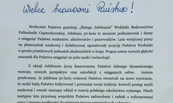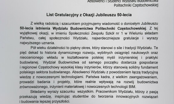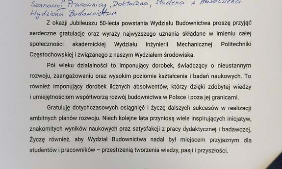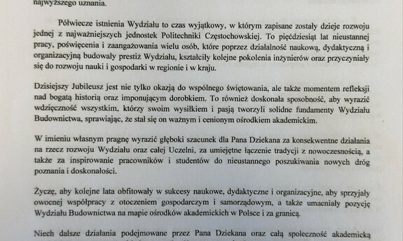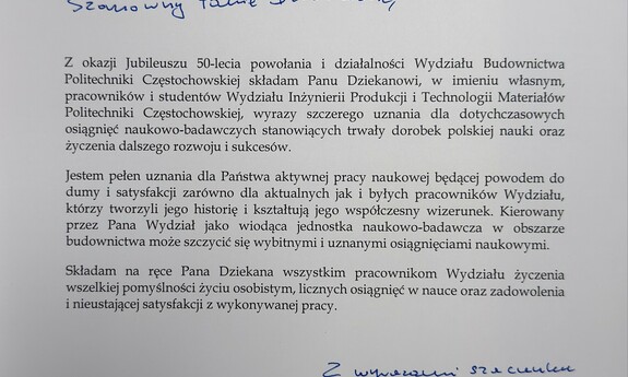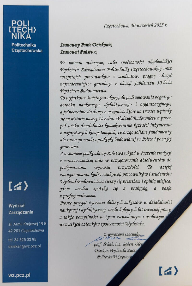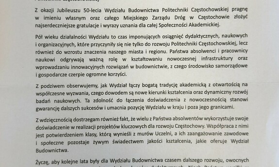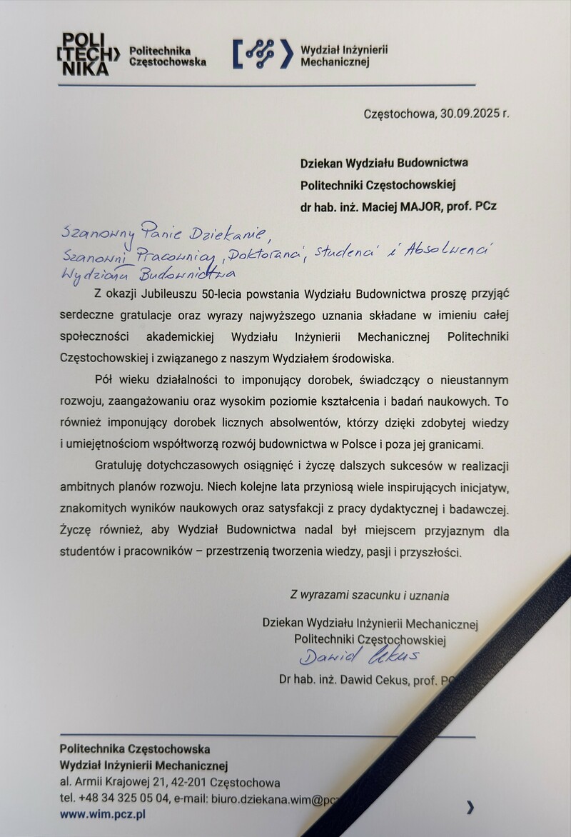 Z okazji jubileuszu 50-lecia Wydziału Budownictwa na ręce Dziekana dr hab. inż. Macieja Majora, prof. PCz przekazano liczne listy gratulacyjne od władz Politechniki Częstochowskiej, przedstawicieli świata nauki, polityki, a także firm współpracujących oraz partnerów naukowych i instytucjonalnych.