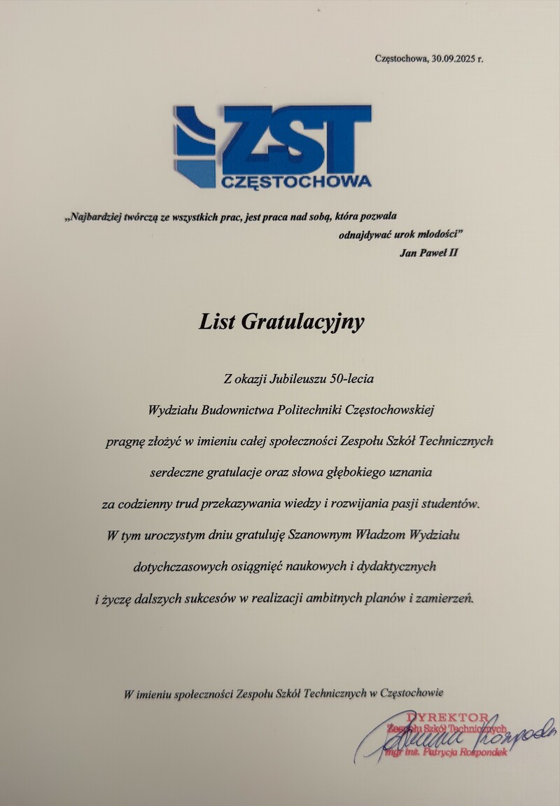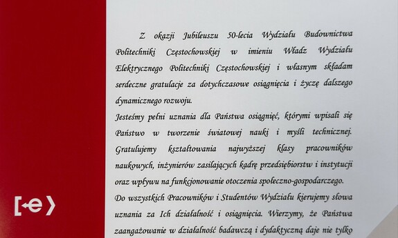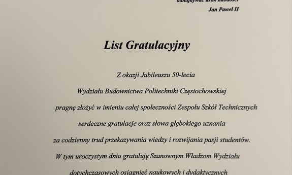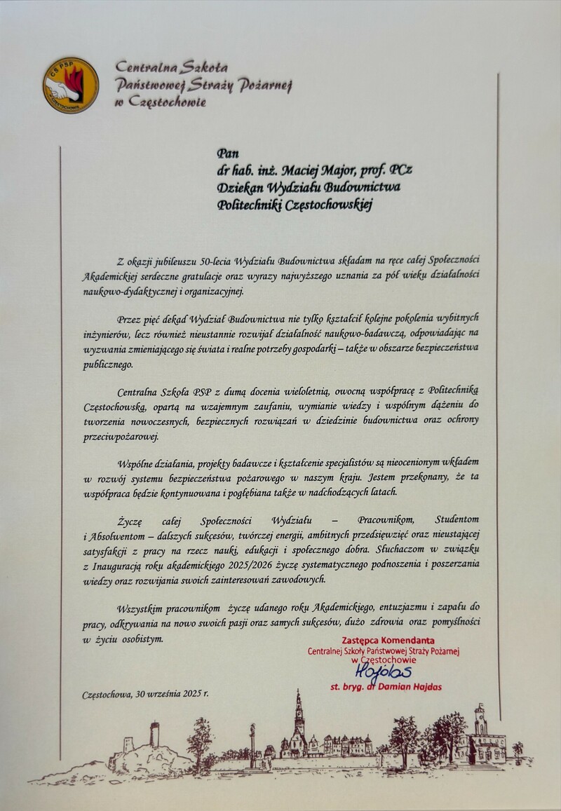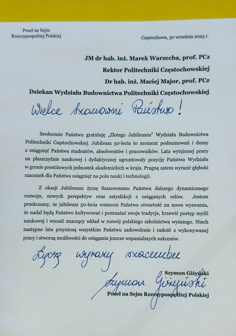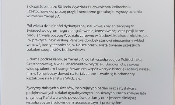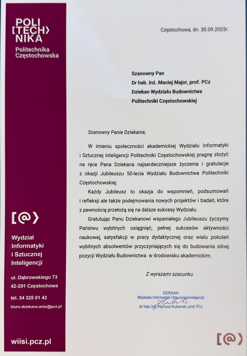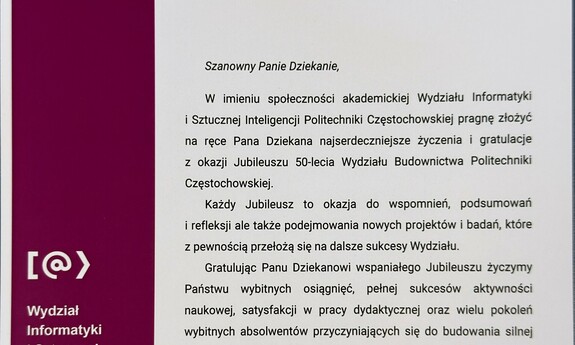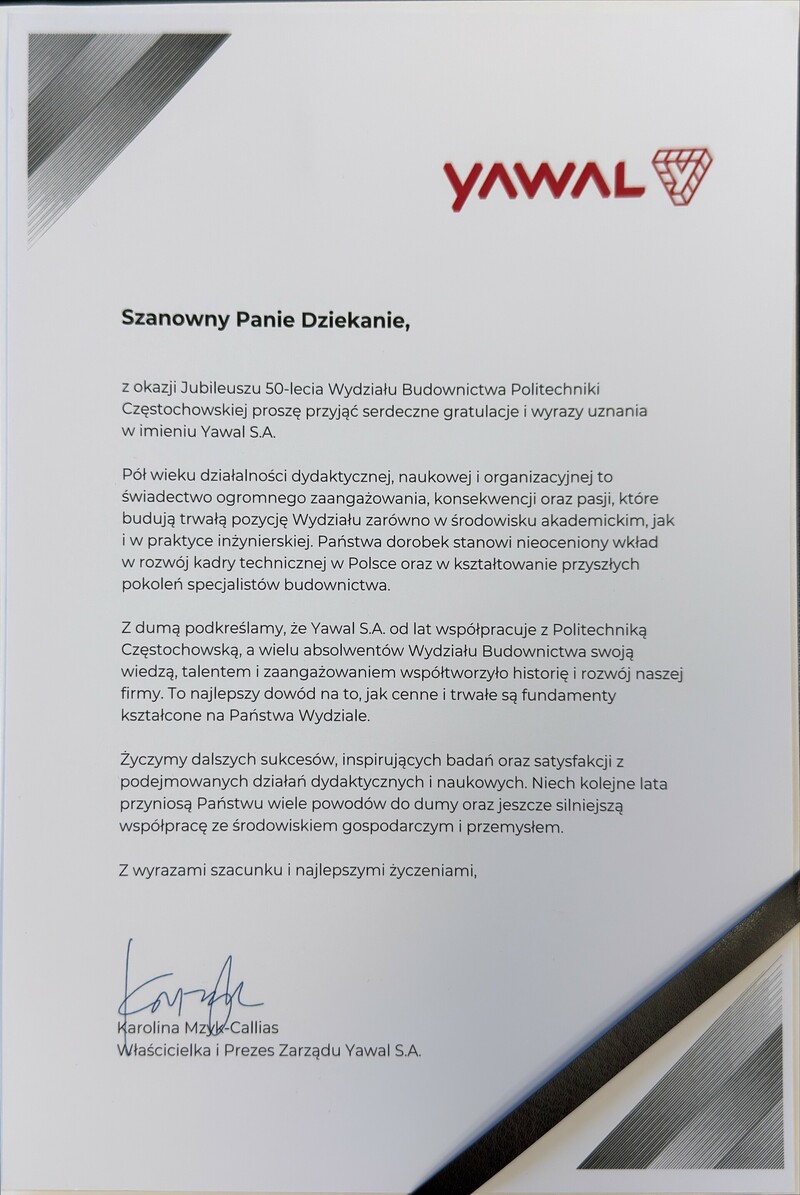 Z okazji jubileuszu 50-lecia Wydziału Budownictwa na ręce Dziekana dr hab. inż. Macieja Majora, prof. PCz przekazano liczne listy gratulacyjne od władz Politechniki Częstochowskiej, przedstawicieli świata nauki, polityki, a także firm współpracujących oraz partnerów naukowych i instytucjonalnych.