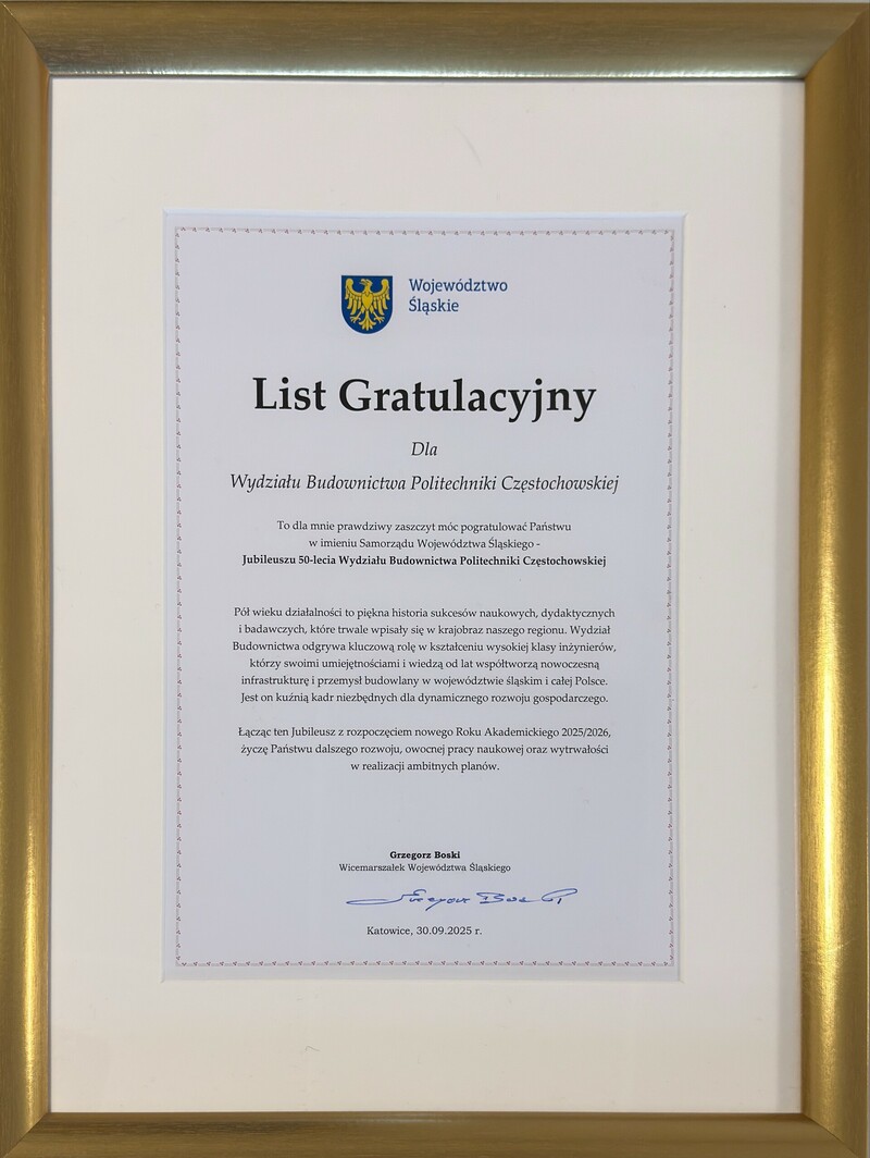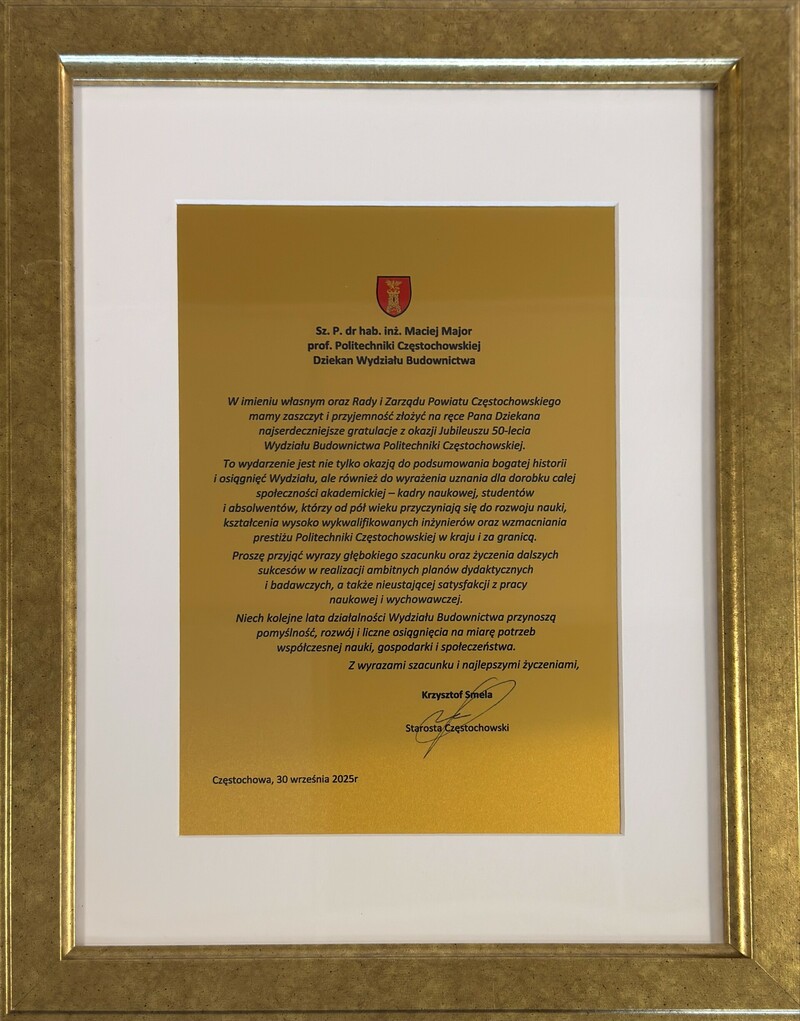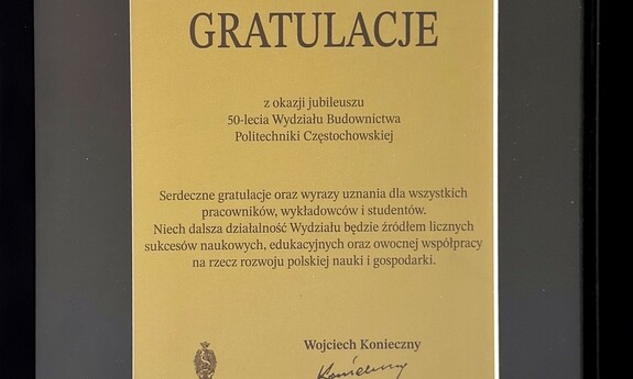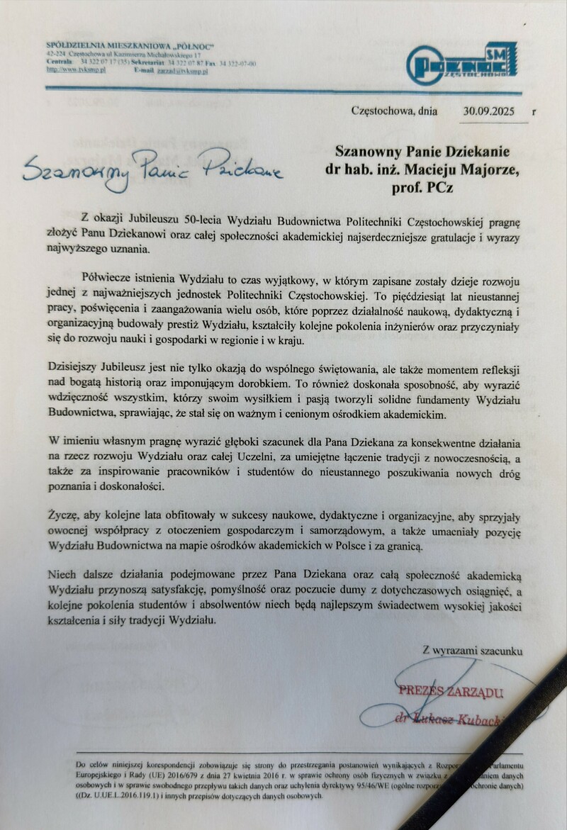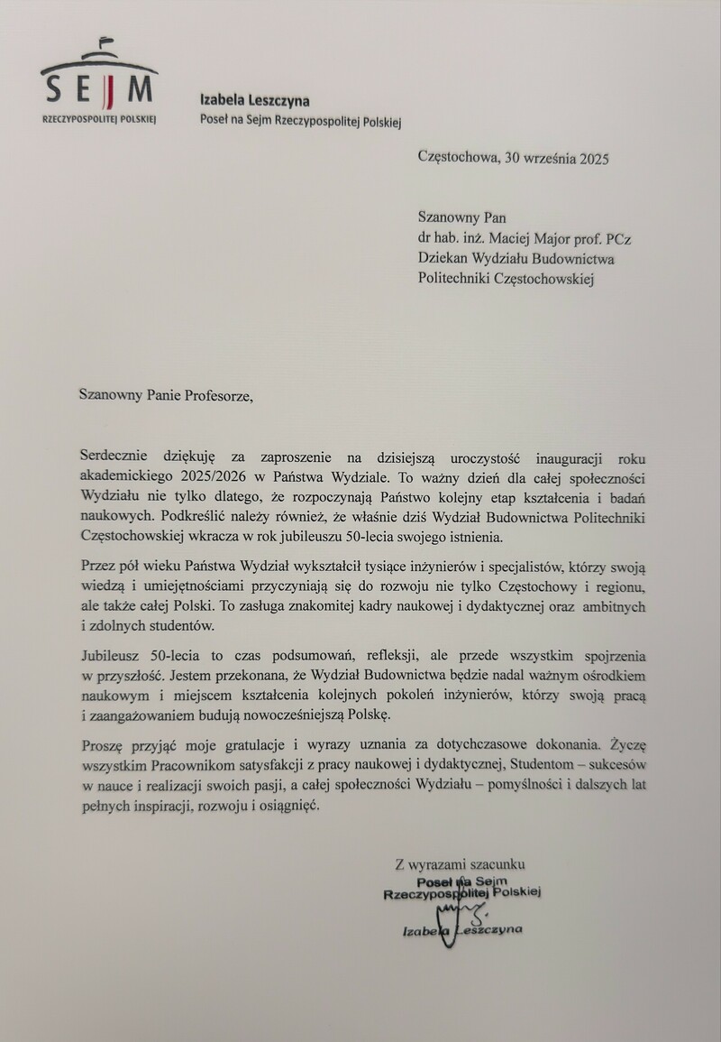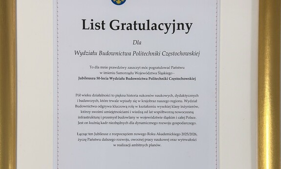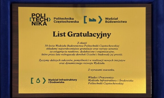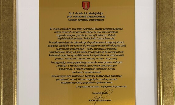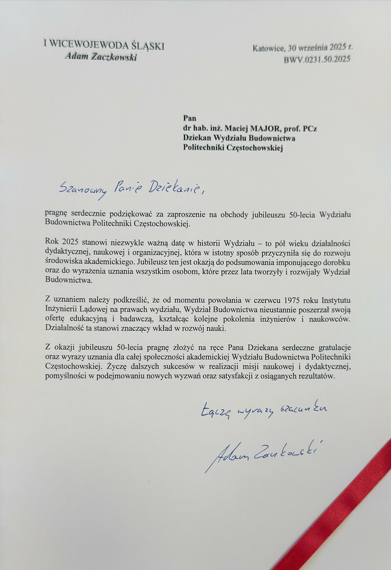 Z okazji jubileuszu 50-lecia Wydziału Budownictwa na ręce Dziekana dr hab. inż. Macieja Majora, prof. PCz przekazano liczne listy gratulacyjne od władz Politechniki Częstochowskiej, przedstawicieli świata nauki, polityki, a także firm współpracujących oraz partnerów naukowych i instytucjonalnych.