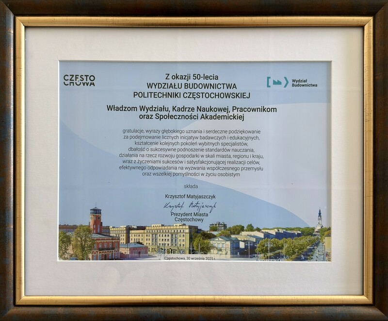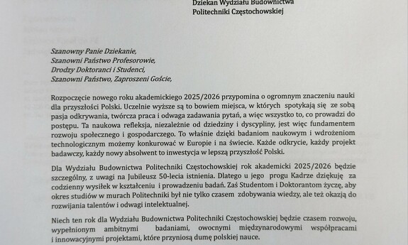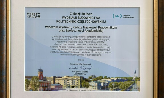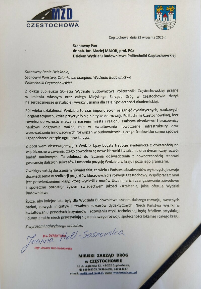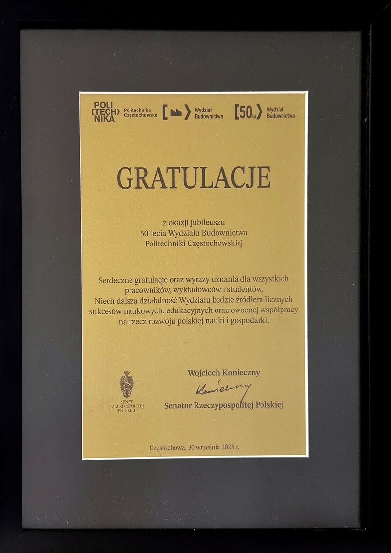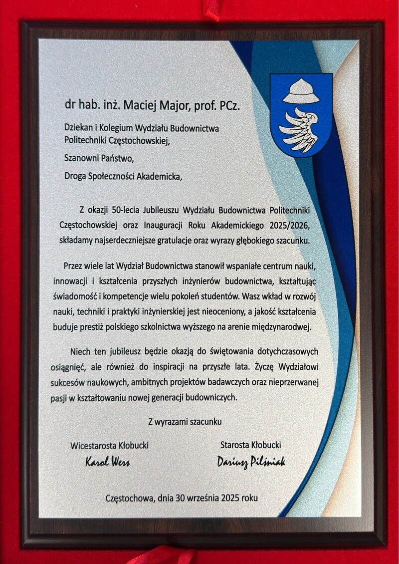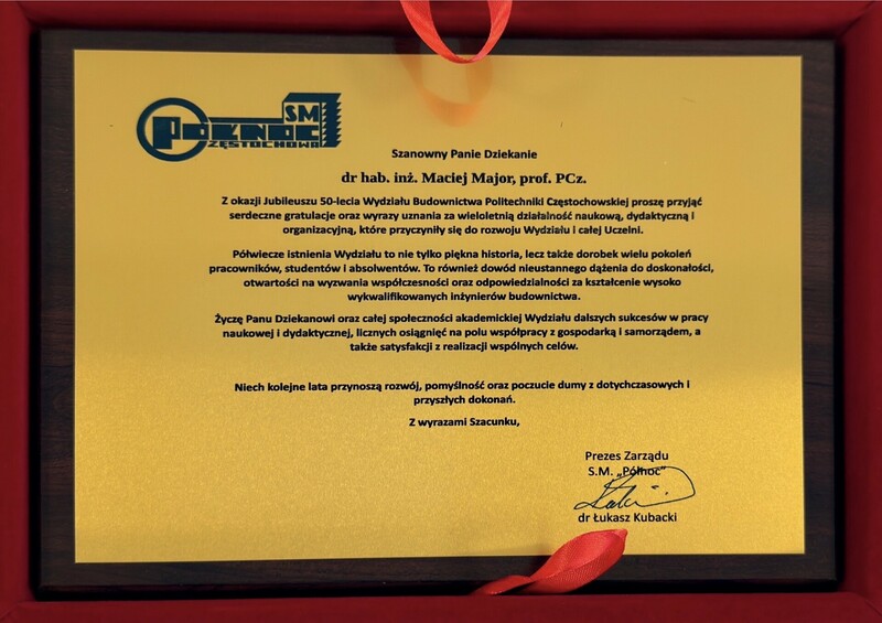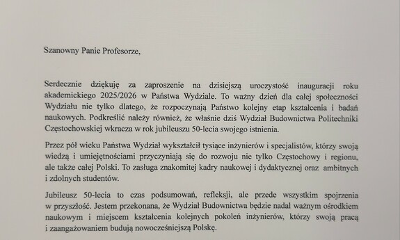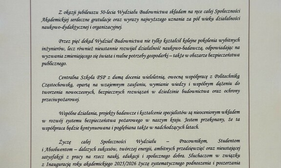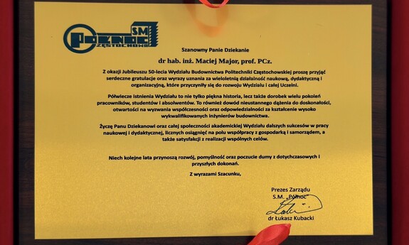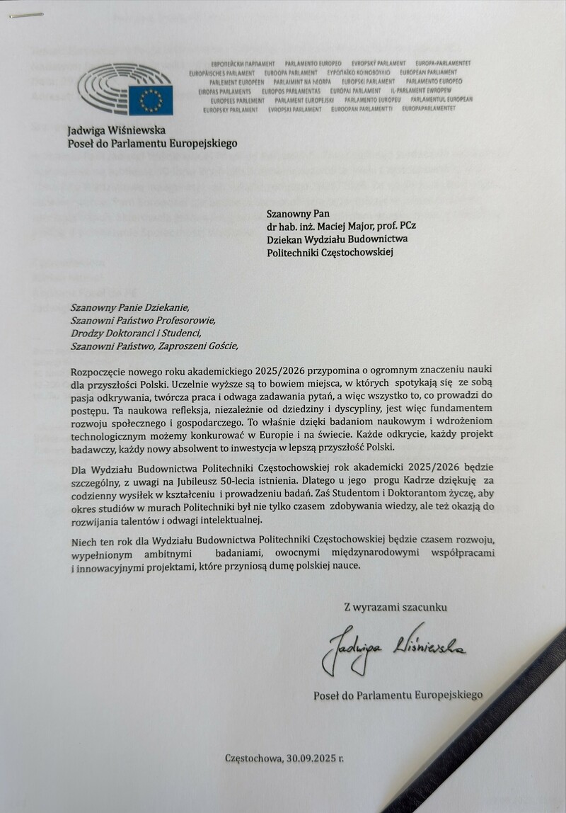 Z okazji jubileuszu 50-lecia Wydziału Budownictwa na ręce Dziekana dr hab. inż. Macieja Majora, prof. PCz przekazano liczne listy gratulacyjne od władz Politechniki Częstochowskiej, przedstawicieli świata nauki, polityki, a także firm współpracujących oraz partnerów naukowych i instytucjonalnych.